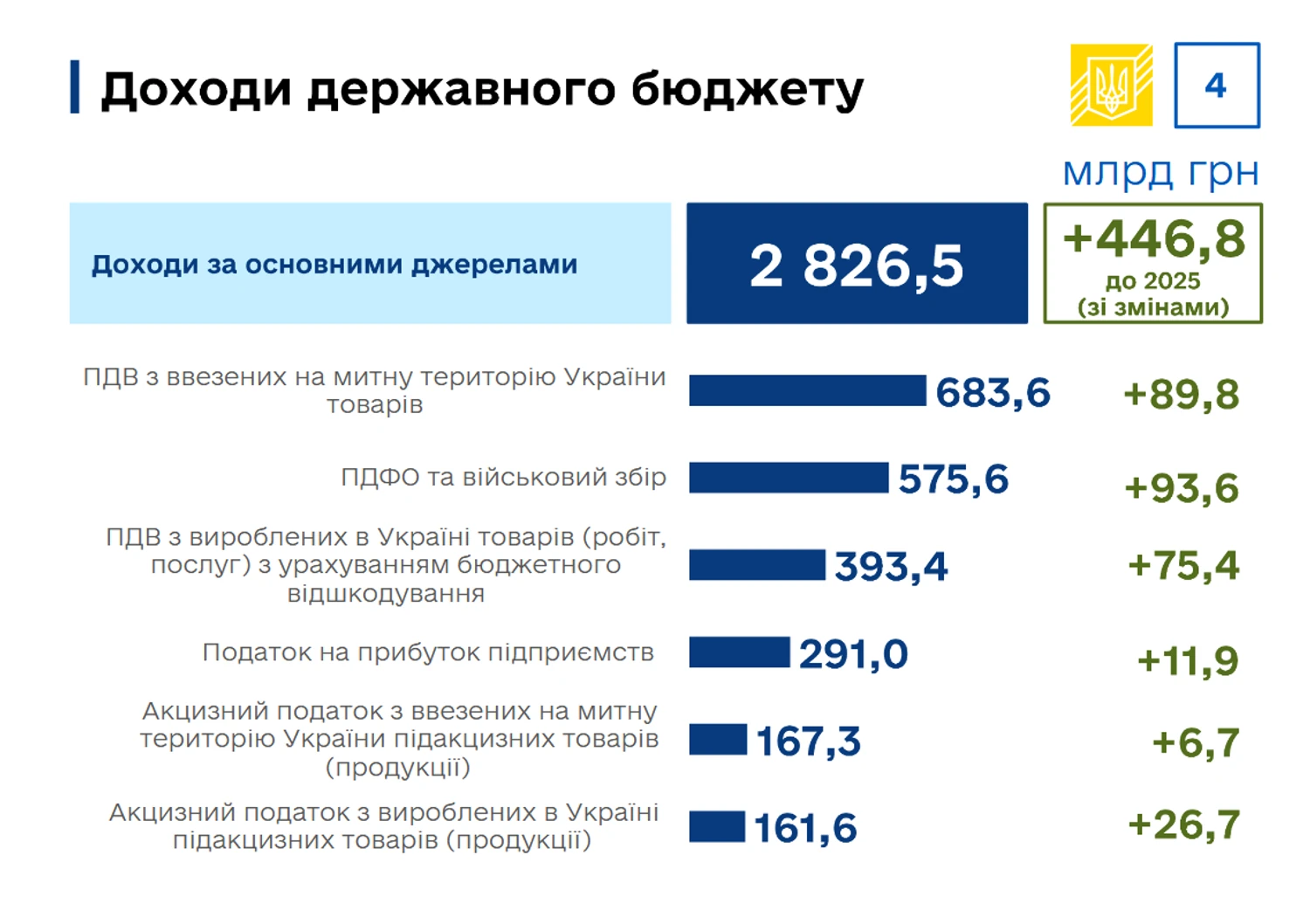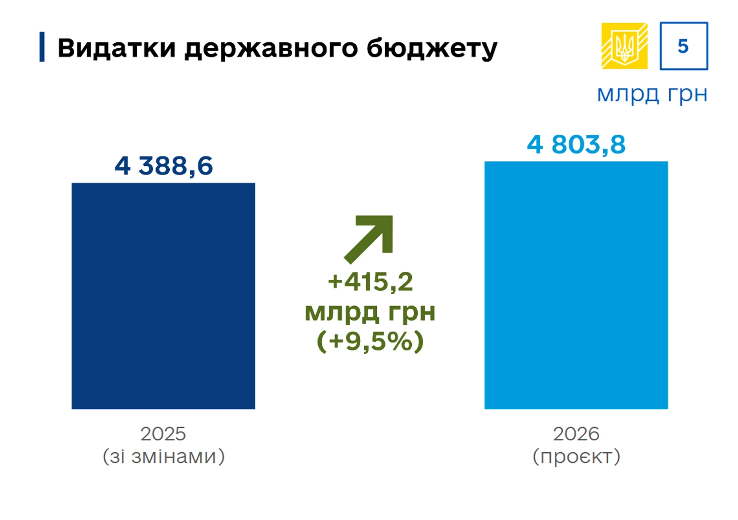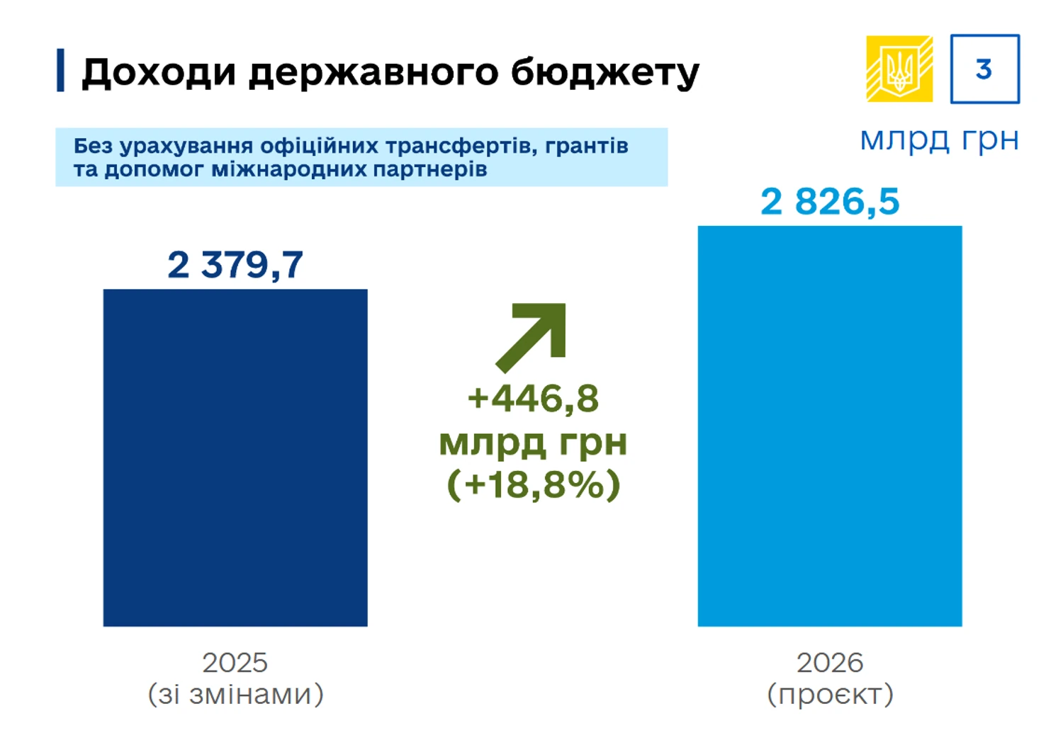 Згідно з проєктом, доходи Державного бюджету становитимуть 2,4 трлн грн, що на 446,8 млрд грн (18,8%) більше порівняно з 2025 роком. Видатки – 4,8 трлн, що на 415 млрд більше порівняно з 2025 роком.